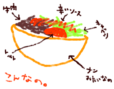 ナンみたいなのの中に、キャベツと牛肉とトマトが入ってて、上からピリ辛ソースがかかってる食べ物でした。お店の人いわく、中辛がオススメだそうです。(下図参照)