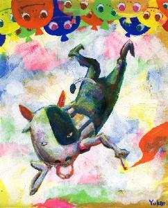 もともと、上に密集している生物は風船で、牛が風船につられているという下書きだったんですが、なんかバランスがおかしく見えたんで、顔をつけてみました。