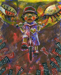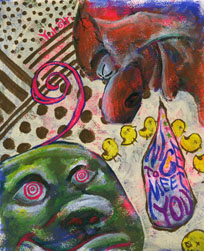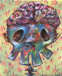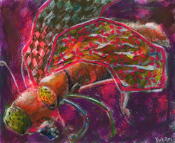 いつもはだいたい、派手な色(蛍光色、ビビット)や暗い色を下において描き始めるのですが、この絵は黄色やオレンジなど、似た感じで、薄めの色を下塗りしました。